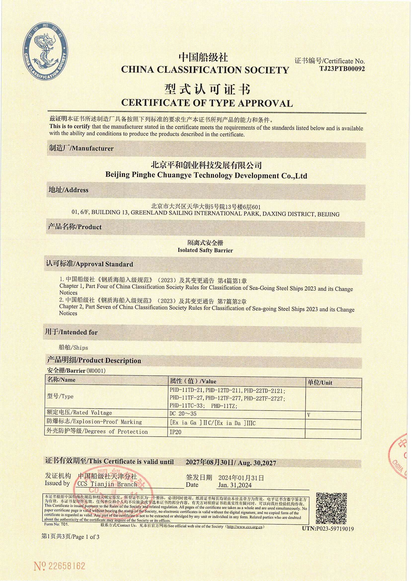 中國(guó)船級(jí)社CCS型式認(rèn)證證書(shū)