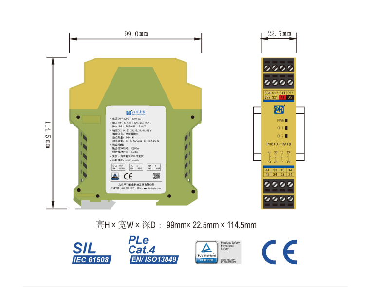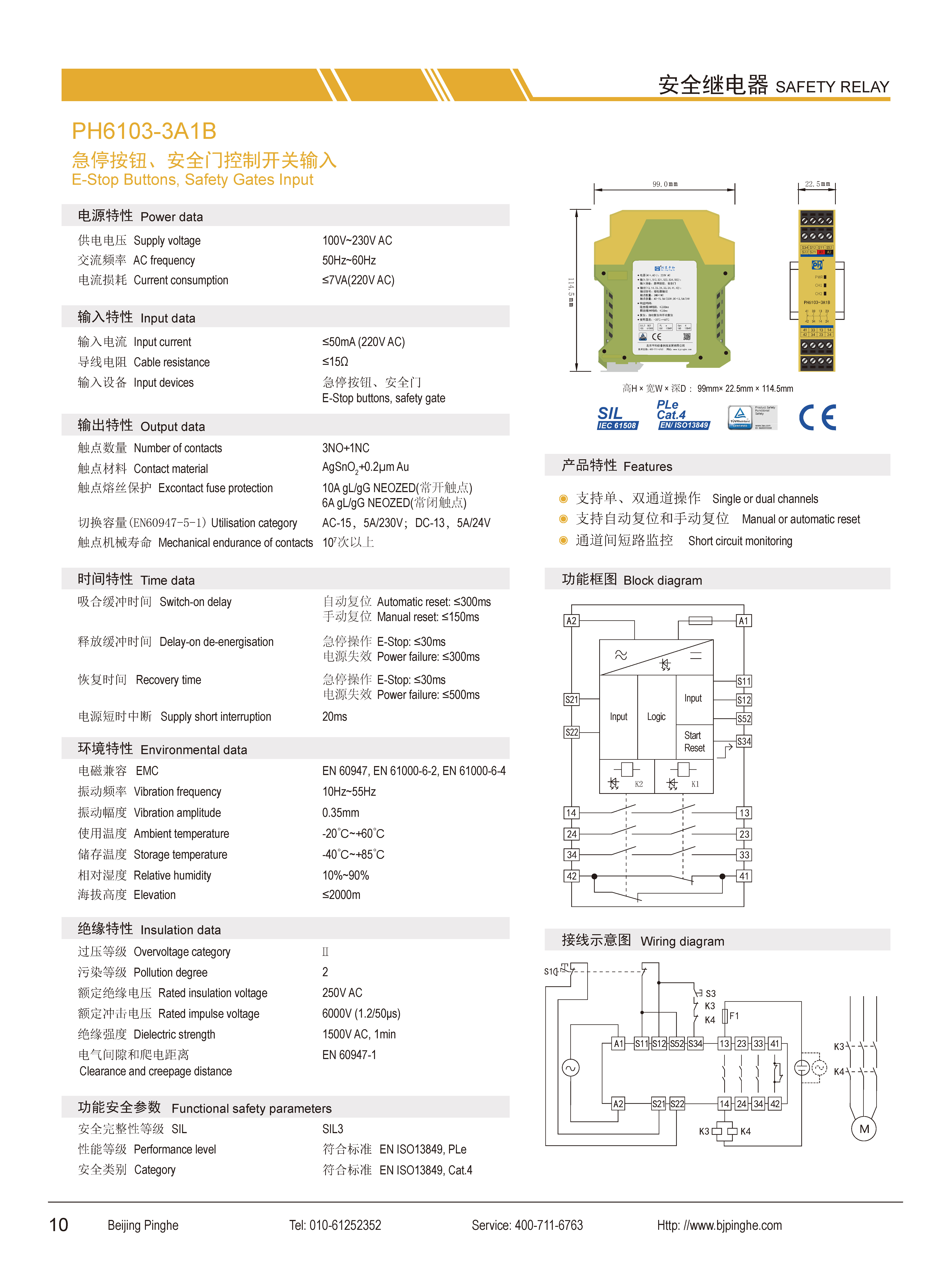 PH6103-3A1B是一款安全繼電器控制模塊,適用于急停按鈕、安全門控制開關(guān)輸入,使用220V交流電源供電,具有3路常開(NO)安全輸出觸點(diǎn)和1路常閉(NC)輔助輸出觸點(diǎn)的安全繼電器。它支持單、雙通道操作,手動或自動復(fù)位,并具有通道間短路監(jiān)控功能。