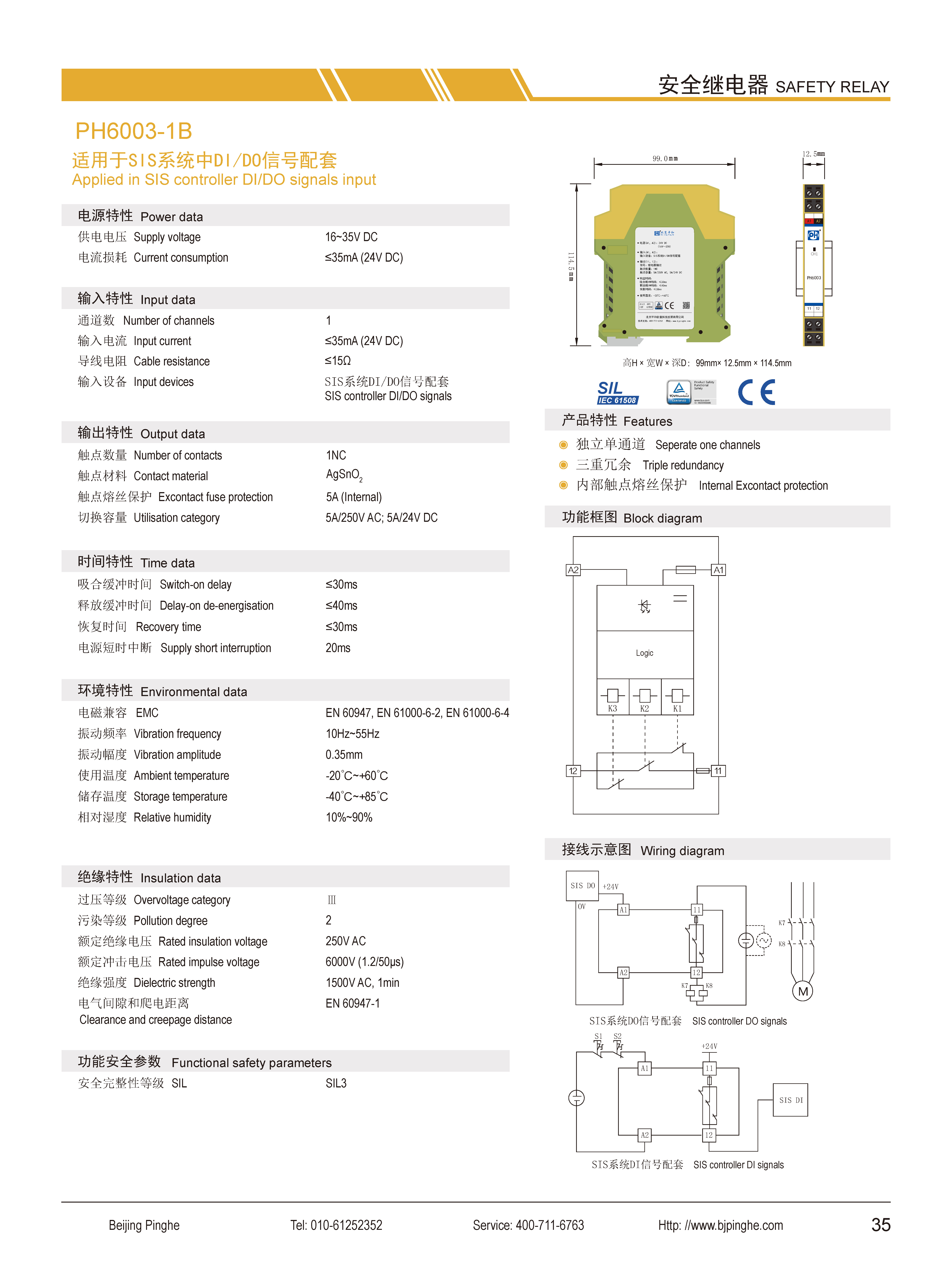 PH6003-1B是一款安全繼電器控制模塊,適用于安全開關(guān)、SIS系統(tǒng)中DO信號隔離轉(zhuǎn)換,具有1路常閉(NC)觸點(diǎn),內(nèi)部電路采用Fail-safe技術(shù),3重冗余技術(shù)和觸點(diǎn)熔接保護(hù)技術(shù)。