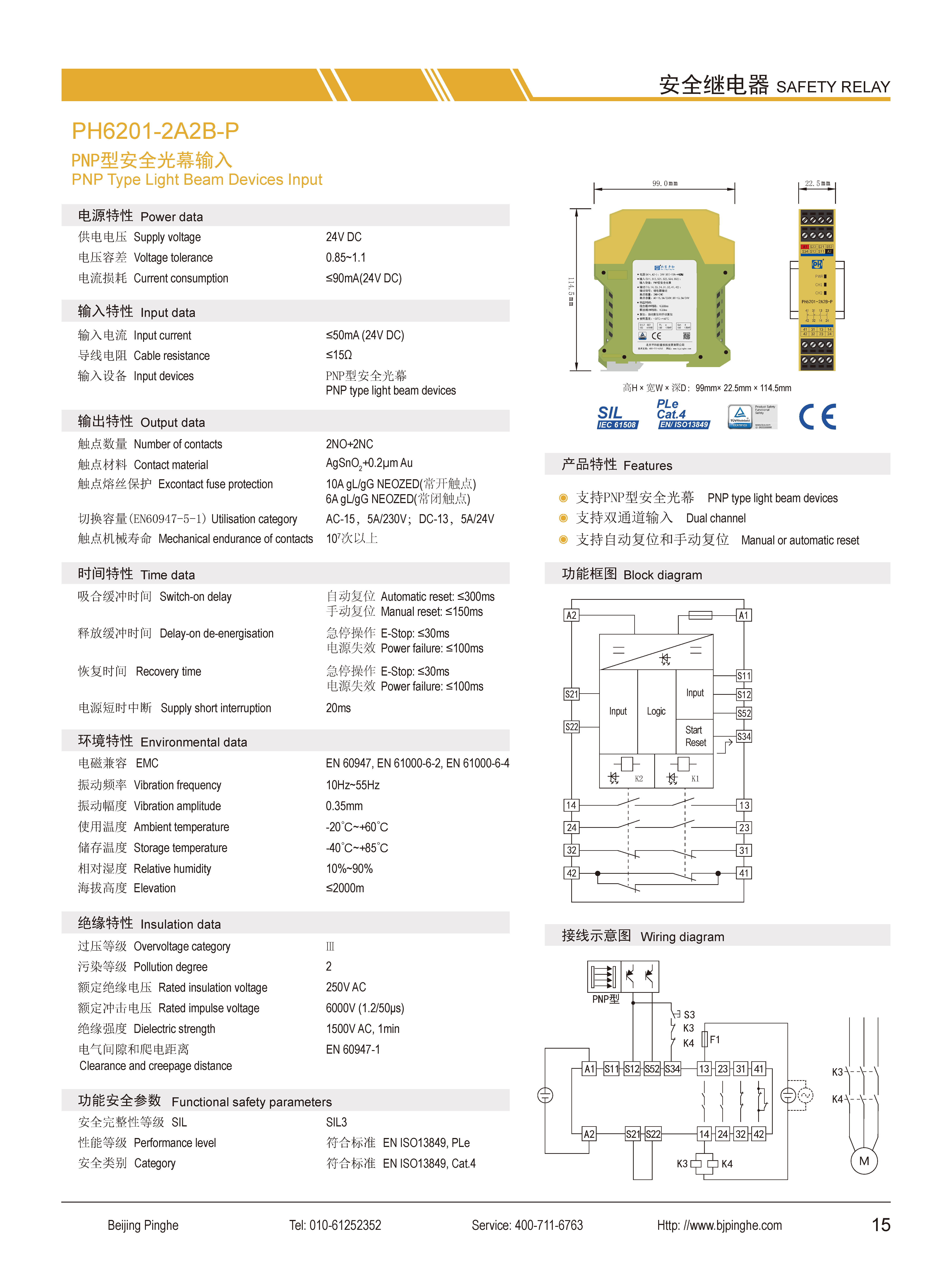 PH6201-2A2B-P是一款安全繼電器控制模塊,適用于PNP型安全光幕輸入,具有2路常開(NO)安全輸出觸點和2路常閉(NC)輔助輸出觸點的安全繼電器。它支持單、雙通道操作,手動或自動復位,并具有通道間短路監(jiān)控功能。