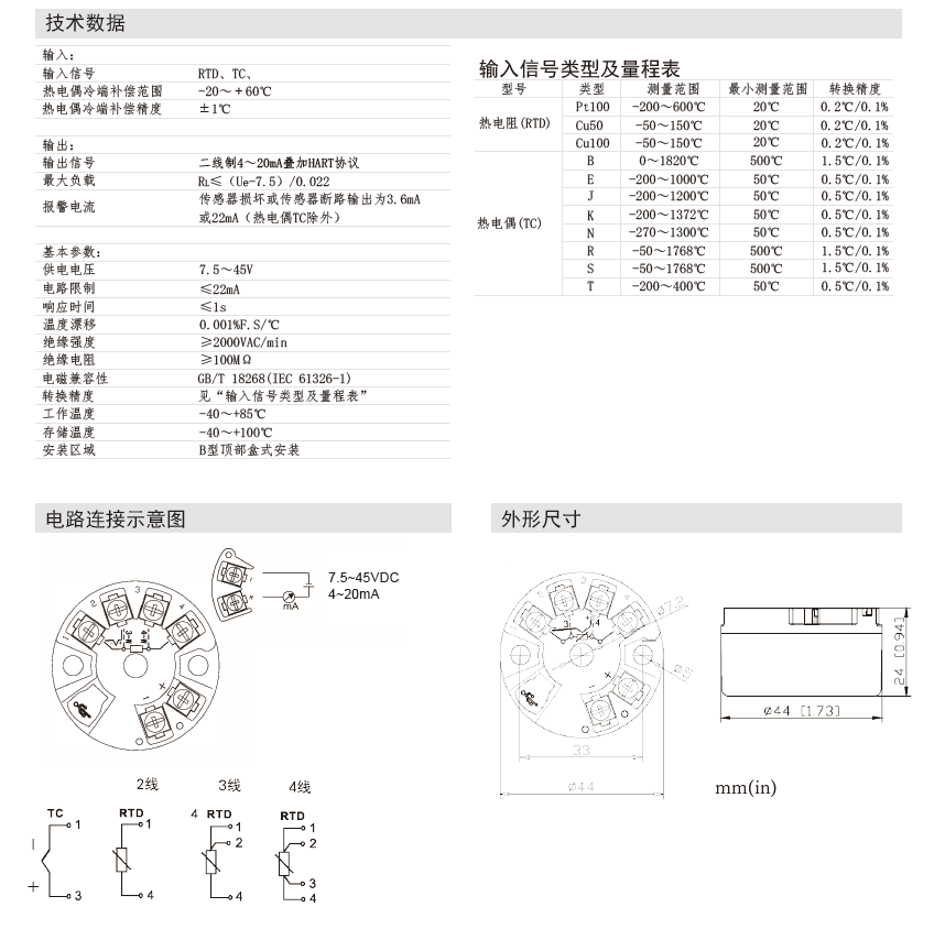 PH智能溫度變送器,用于熱電阻(RTD)、熱電偶(TC),二線制4~20mA模擬輸出,安裝于傳感器內(nèi)部(Form B)。