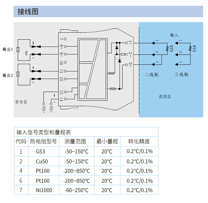 適用的現(xiàn)場(chǎng)設(shè)備 | 二線或三線熱電阻G53、Cu50、Pt100、Pt1000、Ni1000 |