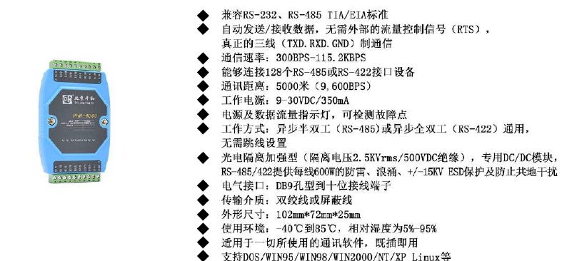 工作方式 | 異步半雙工(RS-485)或異步全雙工(RS-422)通用,無需跳線設(shè)置 |