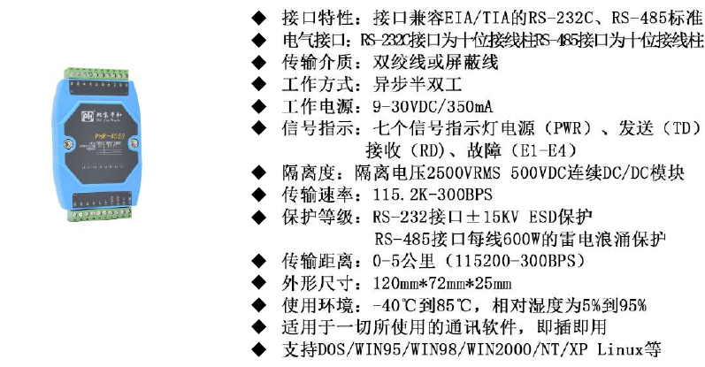 保護(hù)等級(jí) | RS-232接口士15KV ESD保護(hù)RS-485接口每線600W的雷電浪涌保護(hù) |