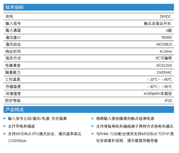 將工業(yè)現(xiàn)場的4路開關(guān)量分別隔離轉(zhuǎn)換為數(shù)字信號(hào),按照MODBUS規(guī)約,通過RS485通訊方式,將數(shù)字信號(hào)提供給PHM-7100,PLC或上位機(jī)等控制器或數(shù)據(jù)采集系統(tǒng)。完善的隔離設(shè)計(jì)理念非常適合工業(yè)現(xiàn)場的復(fù)雜工況,長期穩(wěn)定性好,每路提供隔離的觸點(diǎn)檢測電源,增加了觸點(diǎn)檢測的可靠性、抗干擾性能優(yōu)異。