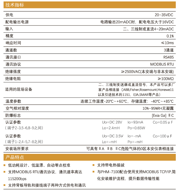 將工業(yè)現(xiàn)場危險區(qū)的3路電流信號隔離轉(zhuǎn)換為數(shù)字信號,按照MODBUS RTU通訊協(xié)議。通過RS485通訊方式,將數(shù)字信號提供給PHM-7100、PLC或上位機系統(tǒng)。