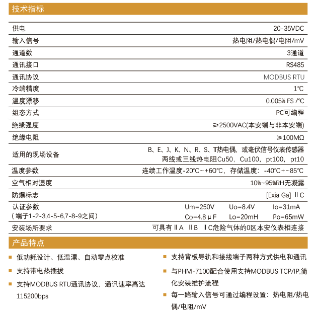 將工業(yè)現(xiàn)場危險(xiǎn)區(qū)的3路溫度信號隔離轉(zhuǎn)換為數(shù)字信號,按照MODBUS RTU通訊協(xié)議。通過RS485通訊方式,將數(shù)字信號提供給PHM-7100、PLC或上位機(jī)系統(tǒng)。