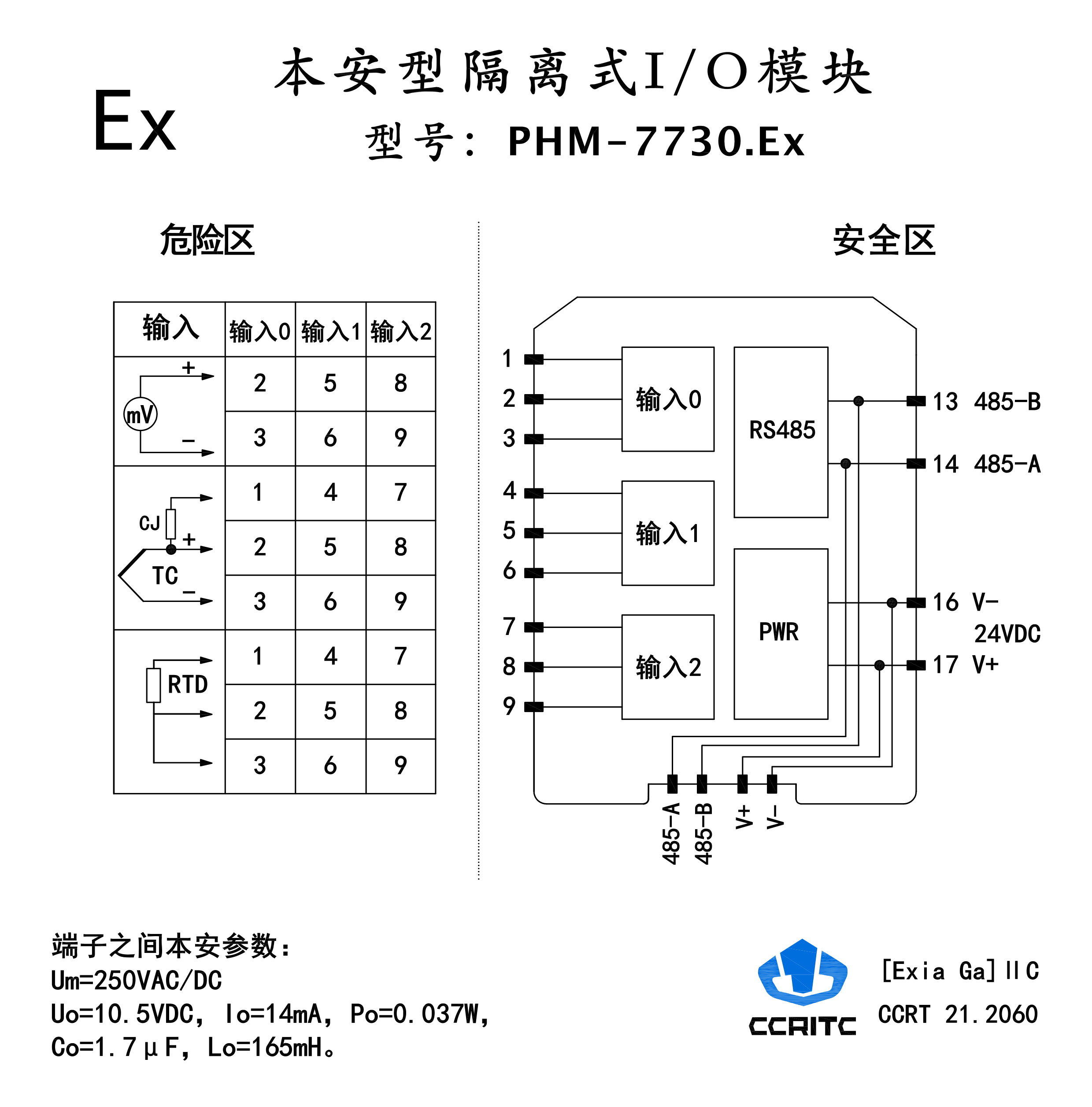認(rèn)證參數(shù) | 端子1-2,4-5,7-8之間:Um=250V Uo=10.5V lo=15mA Co=1.7uF Lo=100mH Po=39.4mW |
