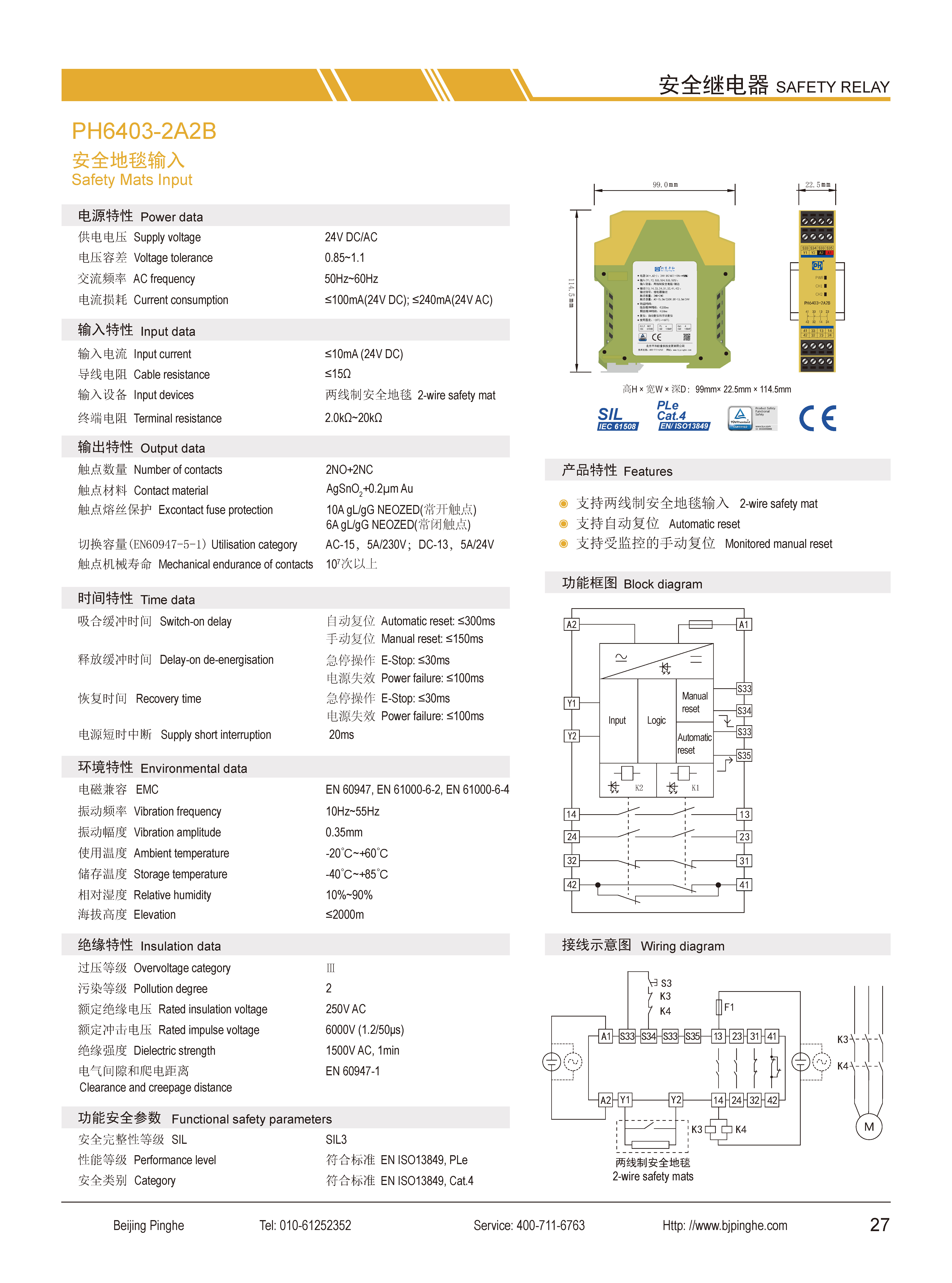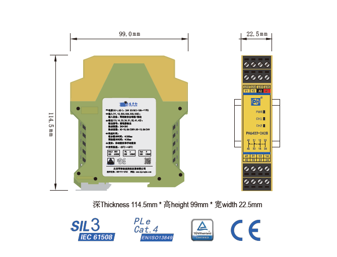 PH6403-2A2B是一款安全繼電器控制模塊,適用于兩線制安全地毯輸入,具有2路常開(NO)安全輸出觸點(diǎn)和2路常閉(NC)輔助輸出觸點(diǎn)的安全繼電器。它支持手動或自動復(fù)位,并具有復(fù)位按鈕監(jiān)控功能。