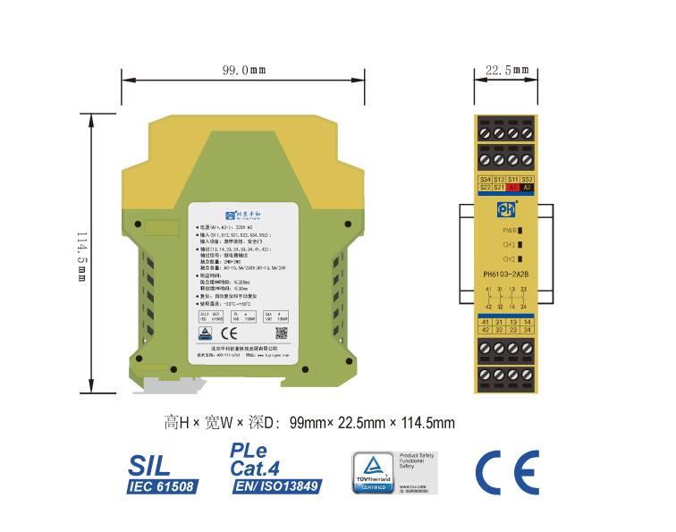 PH6103-2A2B是一款安全繼電器控制模塊,適用于急停按鈕、安全門控制開關(guān)輸入,