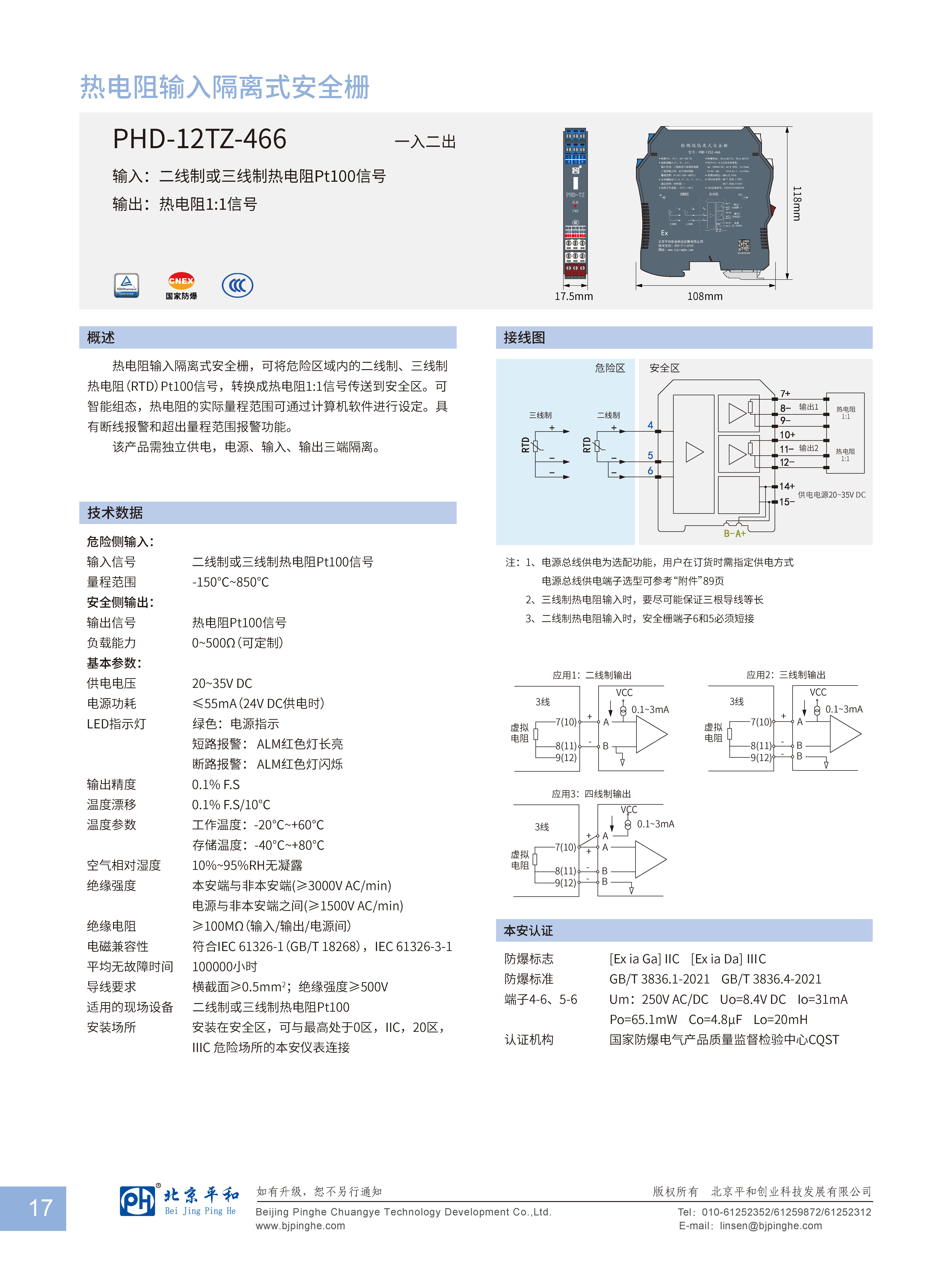 熱電阻輸入隔離式安全柵,可將危險區(qū)域內(nèi)的二線制、三線制熱電阻(RTD)Pt100信號,轉換成熱電阻1:1信號傳送到安全區(qū)??芍悄芙M態(tài),熱電阻的實際量程范圍可通過計算機軟件進行設定。具有斷線報警和超出量程范圍報警功能。