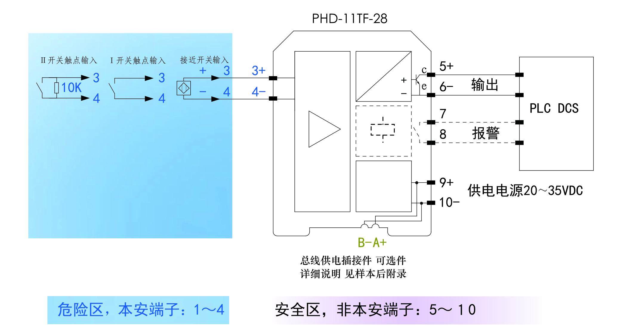 指示燈報警功能 | 現(xiàn)場輸入電流>7mA,短路報警(SC),現(xiàn)場輸入電流<0.1mA,開路報警(LB)開關(guān)觸點(diǎn)輸入,需斷線檢測功能時,須在開關(guān)兩端并聯(lián)10KQ電阻(如下圖接線圖中開關(guān)觸點(diǎn)Ⅱ) |