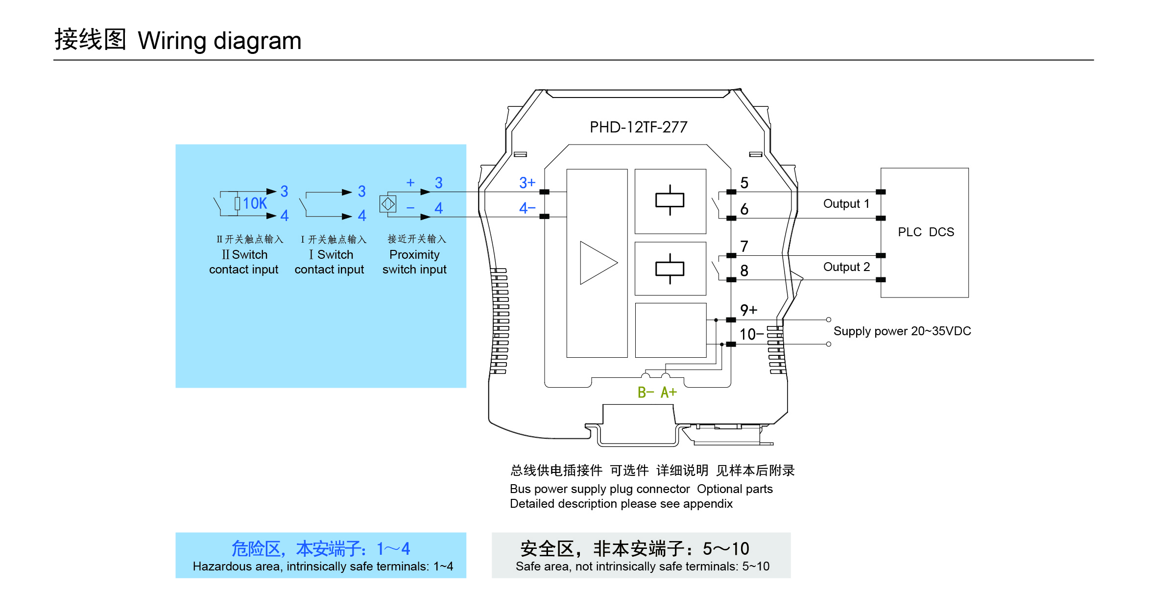 指示燈報警功能 | 現(xiàn)場輸入電流>7mA,短路報警(SC),現(xiàn)場輸入電流<0.1mA,開路報警(LB)開關(guān)觸點輸入,需斷線檢測功能時,須在開關(guān)兩端并聯(lián)10KΩ電阻(如下圖接線圖中開關(guān)觸點Ⅱ) |