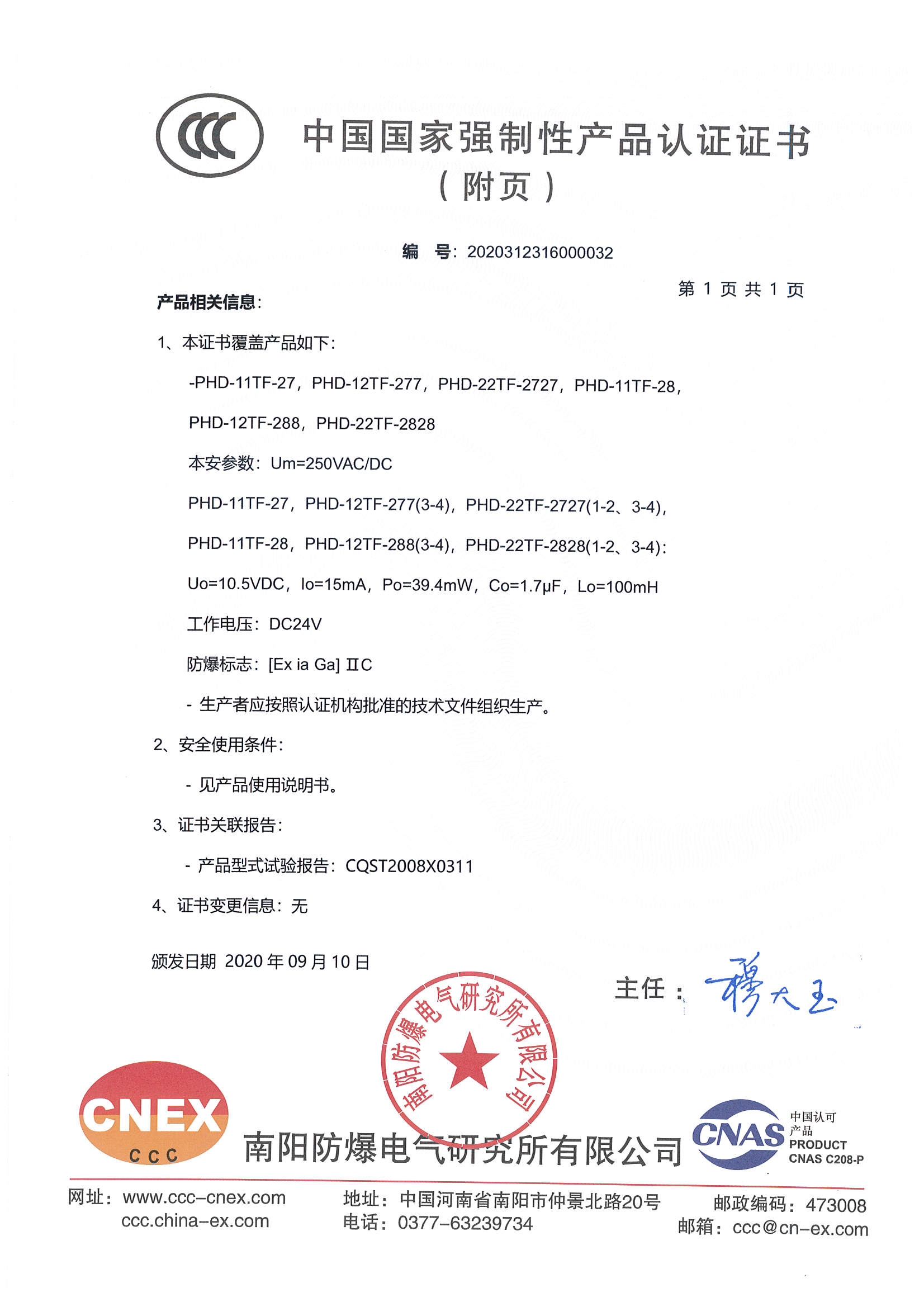 認證參數(shù)(端子3-4)之間 | Um=250V Uo=10.5V Io=15mA Co=1.7uF Lo=150mH Po=39.4mW |