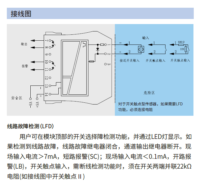 現(xiàn)場(chǎng)輸入電流>7mA,短路報(bào)警(SC),現(xiàn)場(chǎng)輸入電流<0.1mA,開(kāi)路報(bào)警(LB)