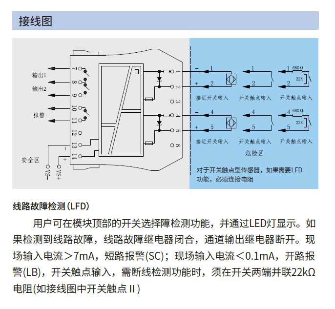 過安全柵隔離傳輸?shù)桨踩珔^(qū)繼電器輸出。線路故障檢測通過單獨的繼電器輸出(選配),并在