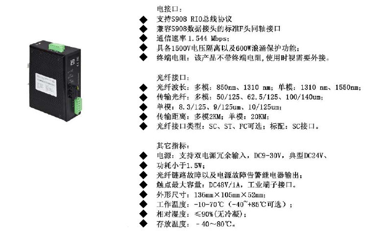 *支持S908 RIO工業(yè)控制現(xiàn)場(chǎng)總線協(xié)議。通信速率1.544M自適應(yīng)。*光纖最遠(yuǎn)通信距離可達(dá)6OKM。