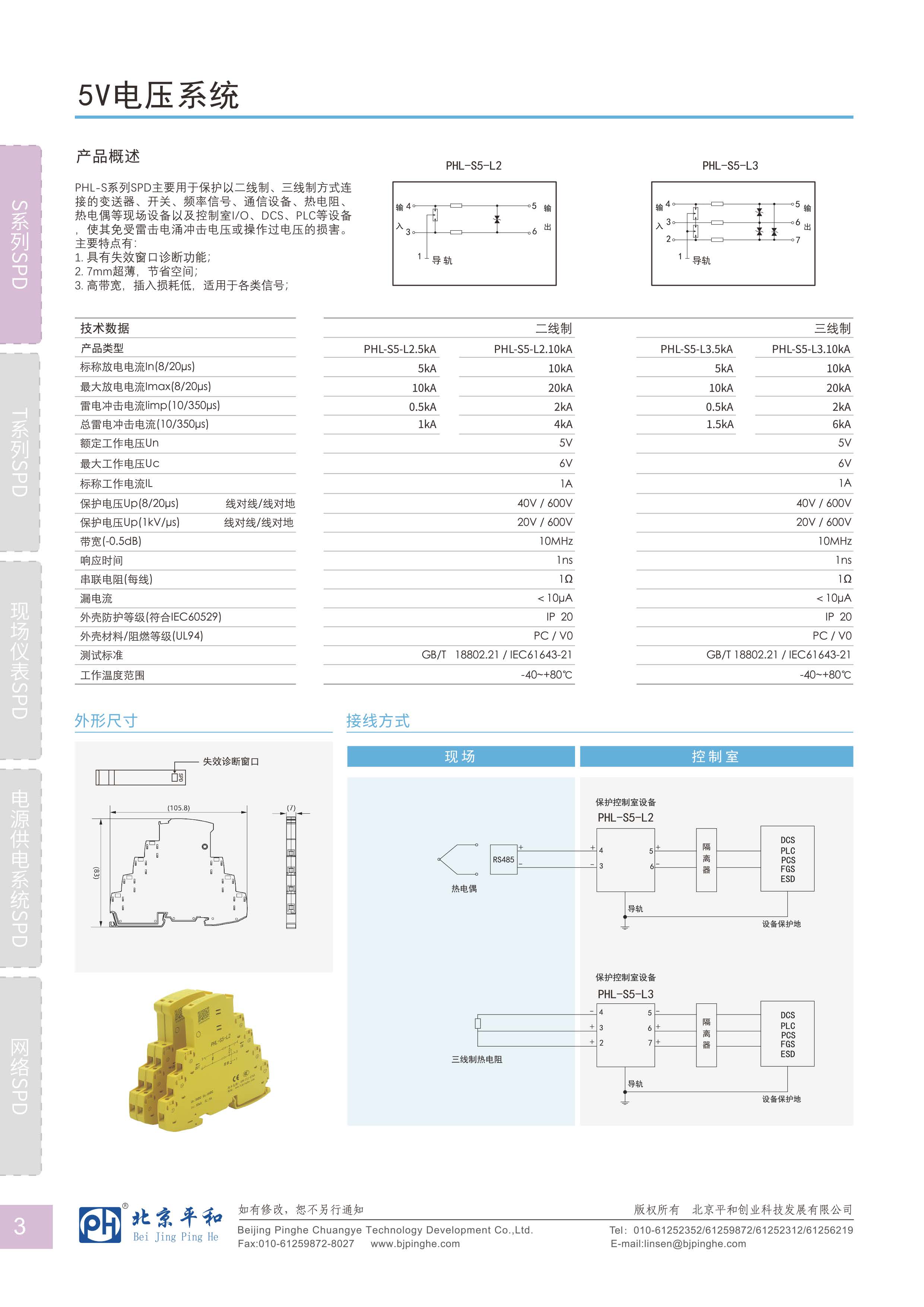 PHL-S系列SPD主要用于保護(hù)以二線制、三線制方式連接的變送器、開關(guān)、頻率信號(hào)、通信設(shè)備、熱電阻、熱電偶等現(xiàn)場(chǎng)設(shè)備以及控制室I/O、DCS、PLC等設(shè)備,使其免受雷擊電涌沖擊電壓或操作過電壓的損害。主要特點(diǎn)有: 1.頂部具有狀態(tài)報(bào)警顯示功能; 2.7mm超薄,節(jié)省空間; 3.高帶寬,插入損耗低,適用于各類信號(hào);
