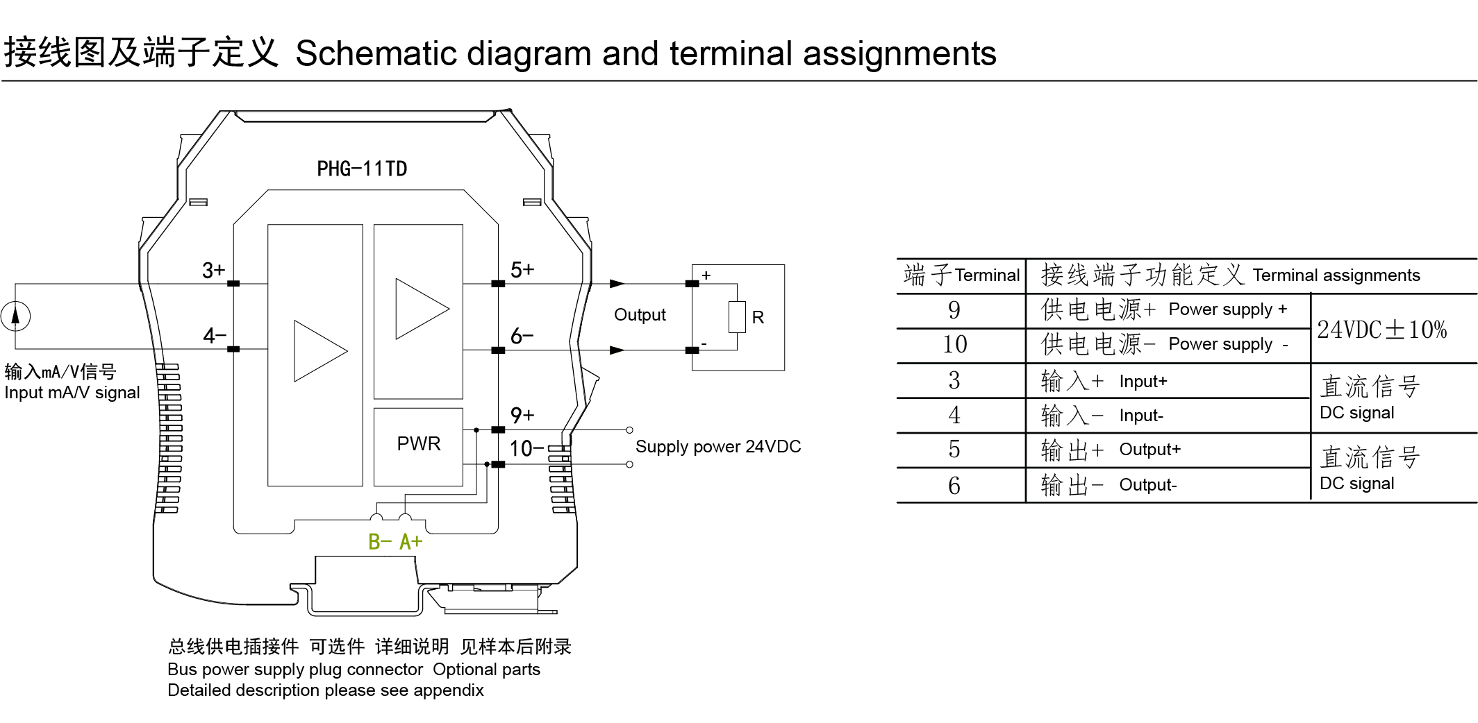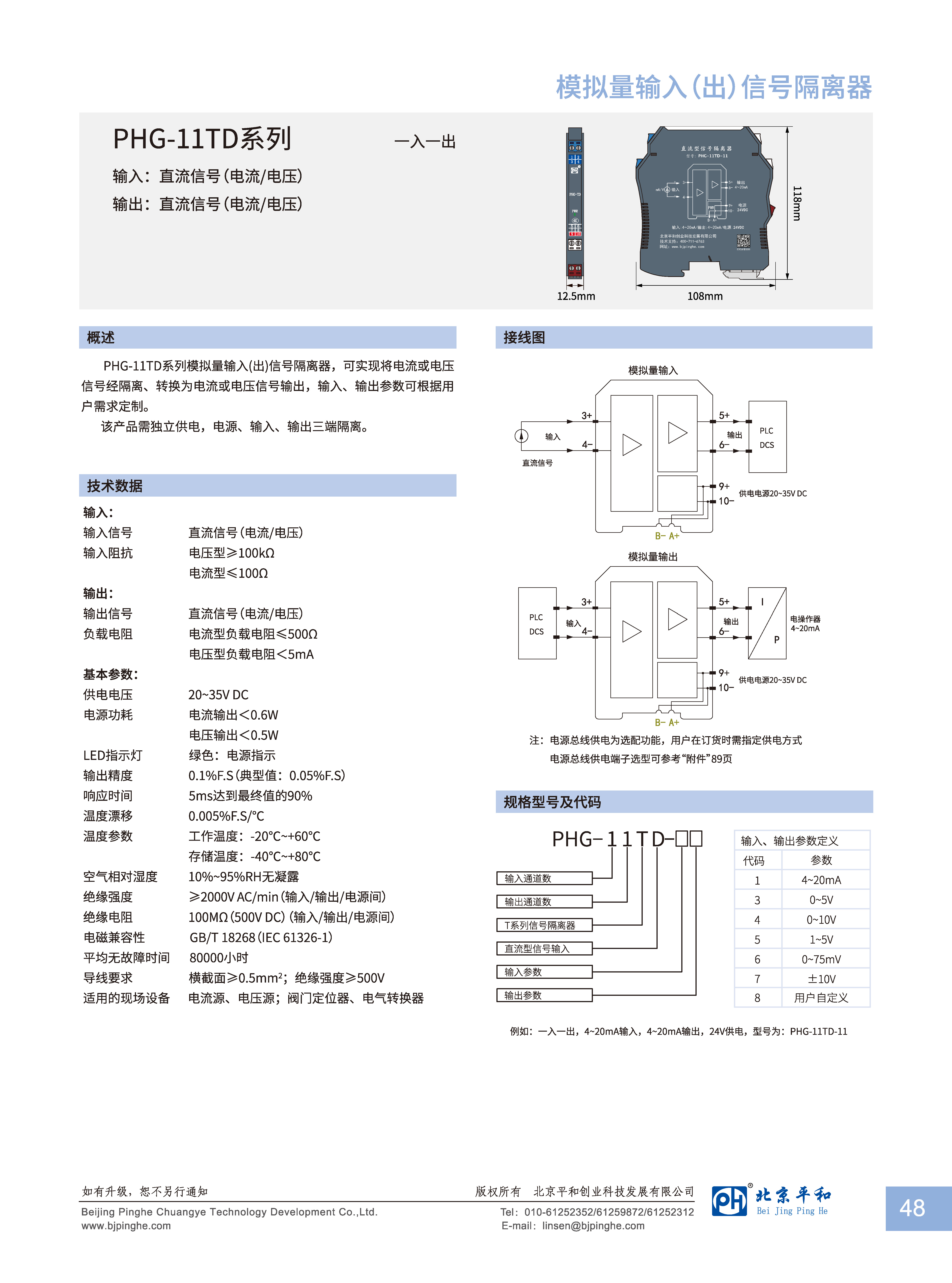 PHG-11TD系列模擬量輸入(出)信號隔離器,可實現(xiàn)將電流或電壓信號經(jīng)隔離、轉(zhuǎn)換為電流或電壓信號輸出,輸入、輸出參數(shù)可根據(jù)用戶需求定制。