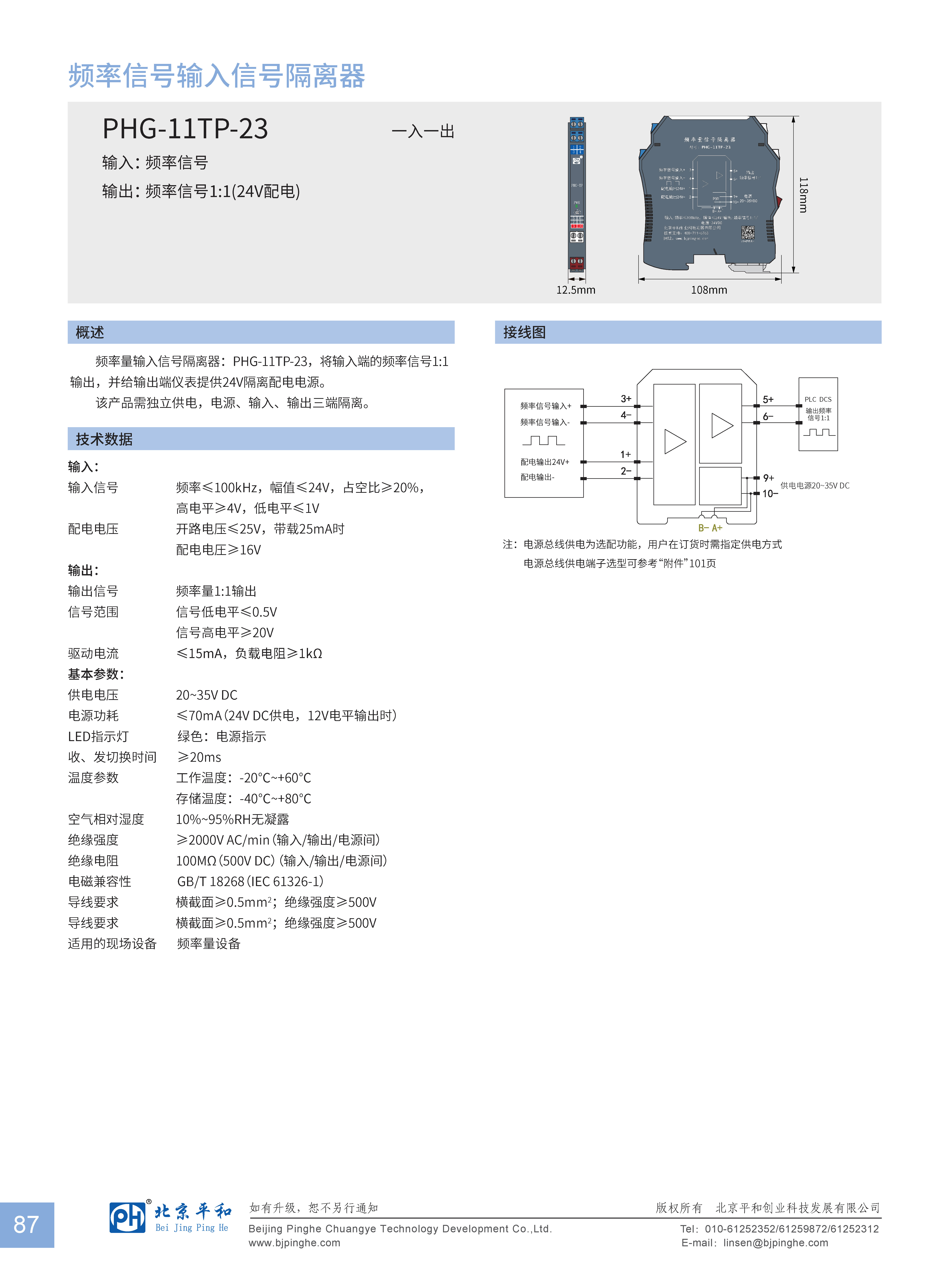 頻率量輸入信號(hào)隔離器:PHG-12TP系列,將輸入端的頻率信號(hào)根據(jù)用戶設(shè)定的量程線性轉(zhuǎn)換成直流信號(hào)輸出。