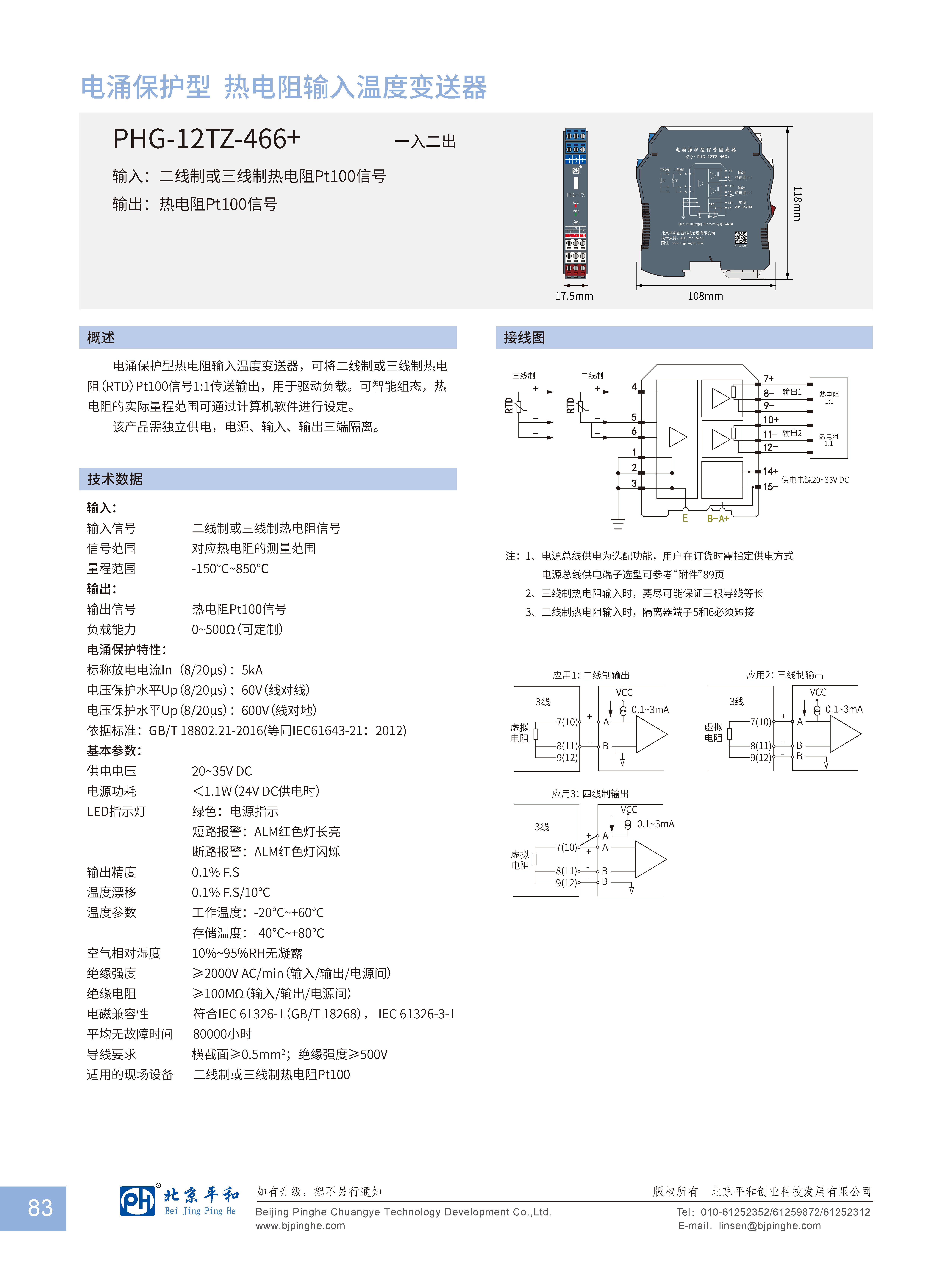 電涌保護型熱電阻輸入溫度變送器,可將二線制或三線制熱電阻(RTD)Pt100信號1:1傳送輸出,用于驅(qū)動負(fù)載??芍悄芙M態(tài),熱電阻的實際量程范圍可通過計算機軟件進行設(shè)定。