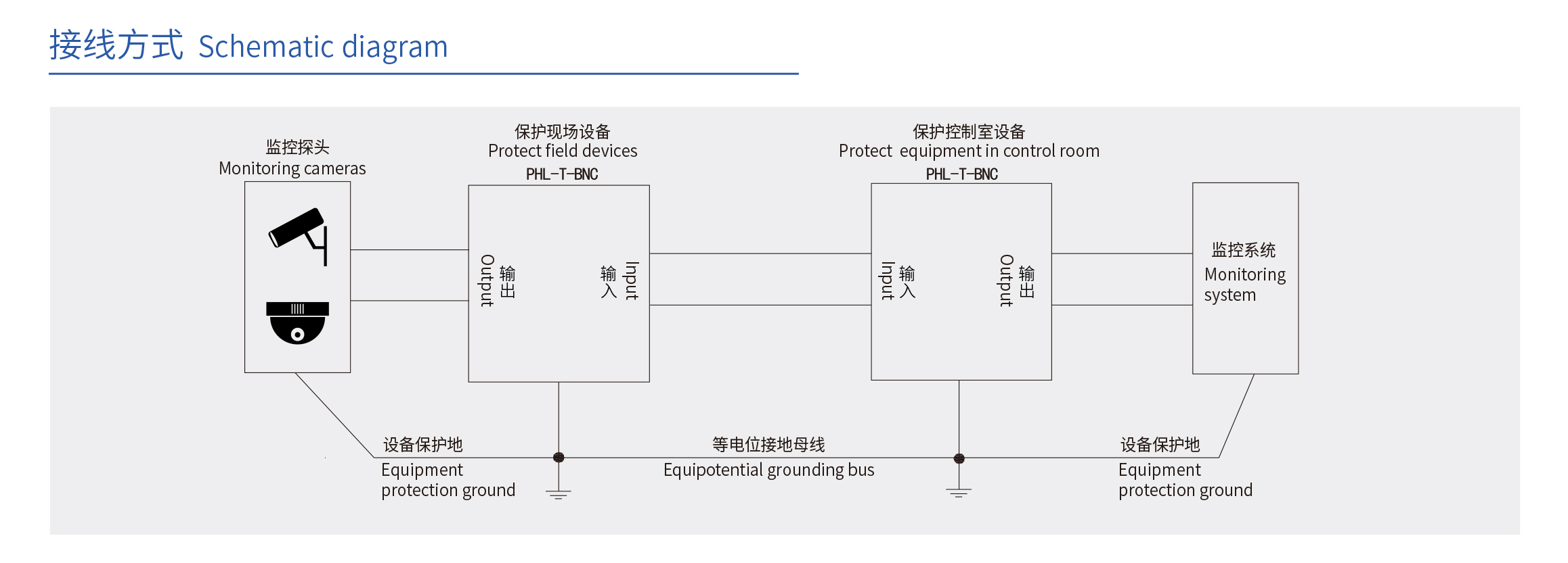 標(biāo)準(zhǔn)BNC同軸接口,用于標(biāo)清同軸視頻監(jiān)控系統(tǒng)的防雷保護。
