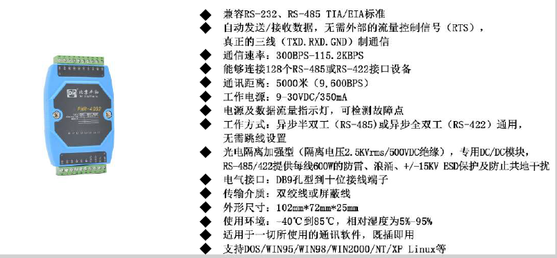 工作方式 | 異步半雙工(RS- 485)或異步全雙工(RS-422)通用,無需跳線設(shè)置 |