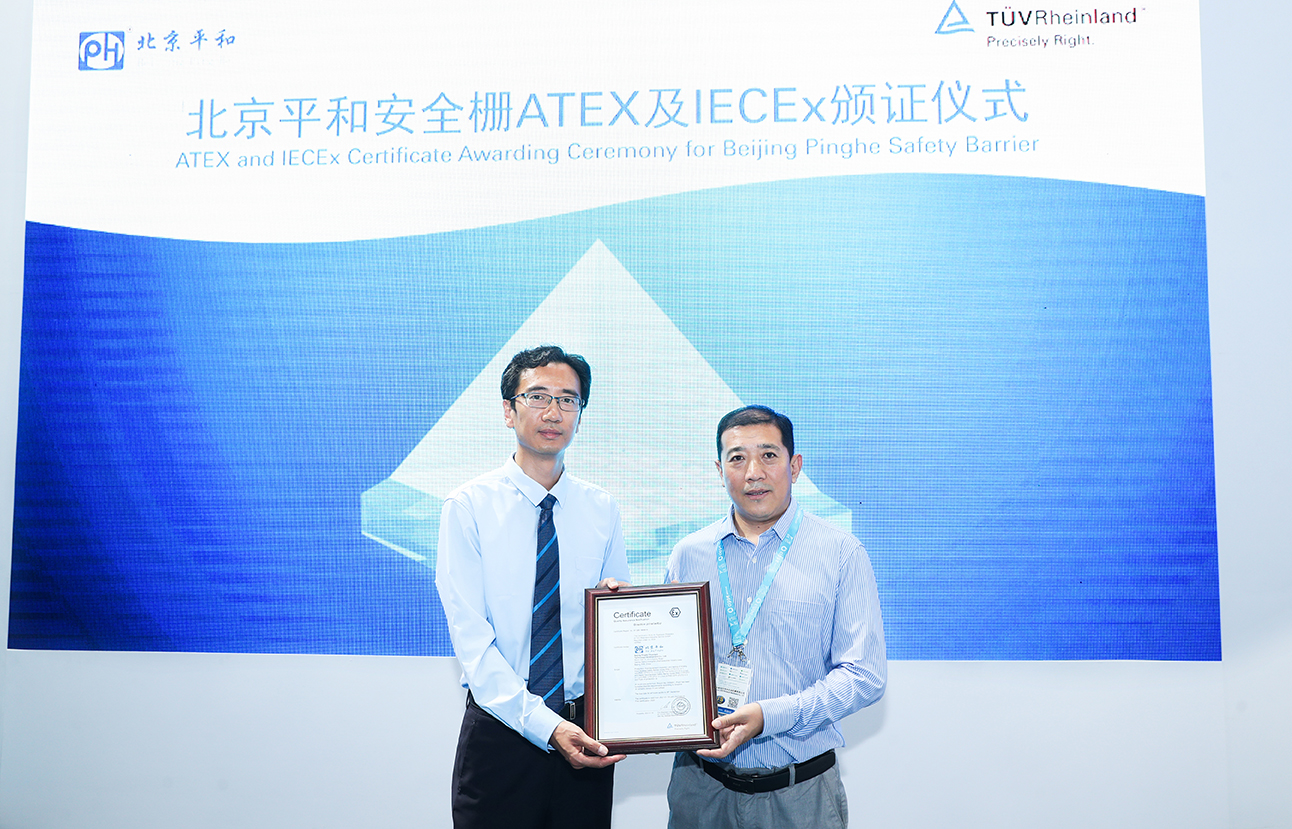 展會(huì)期間,國際獨(dú)立第三方檢測、檢驗(yàn)和認(rèn)證機(jī)構(gòu)德國TÜV萊茵為北京平和的安全柵產(chǎn)品頒發(fā)了ATEX和IECEx證書。北京平和總經(jīng)理招林森、TÜV萊茵大中華區(qū)工業(yè)服務(wù)與信息安全總經(jīng)理張小龍出席了頒證儀式。
