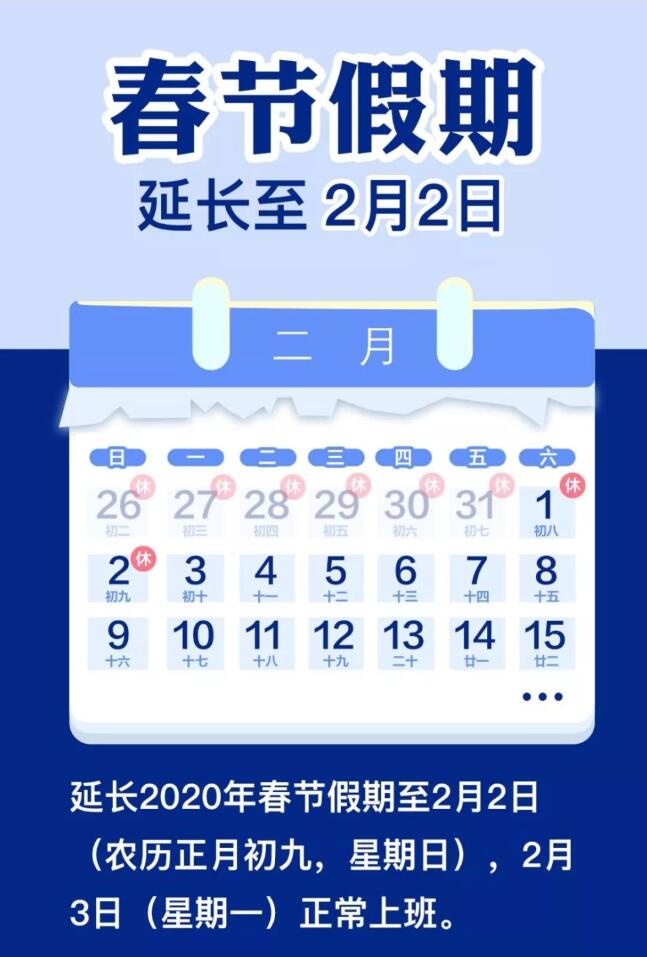 由于受到新型冠狀病毒疫情影響,為保障我司正常上班時車間物料能正常供應,根據(jù)國務院最新通知安排,延長2020年春節(jié)假期至2月2日(農歷正月初九,星期日),2月3日(星期一)起正常上班。