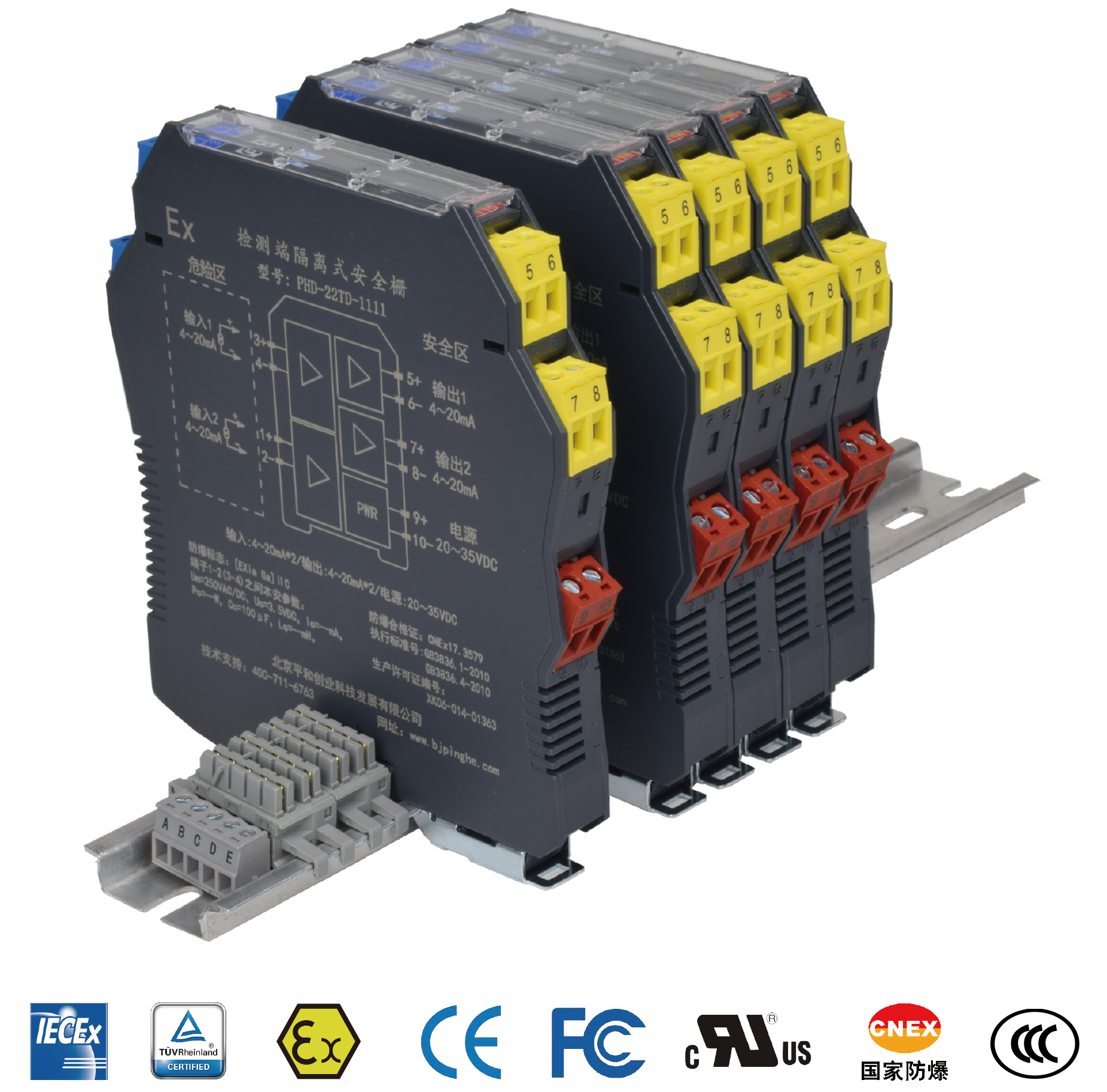 檢測端隔離式安全柵的原理,以北京平和PHD-11TD-21這款產品為例,經過隔離單元和限能單元, 它能夠將危險區(qū)變送器產生的4~20mA信號或直流4~20mA信號,轉換成直接電流/電壓(兼容HART),傳送到安全區(qū)。還能夠給給危險區(qū)變送器提供DC24V電源。本身安裝在DIN35導軌上,采取獨立供電方式。