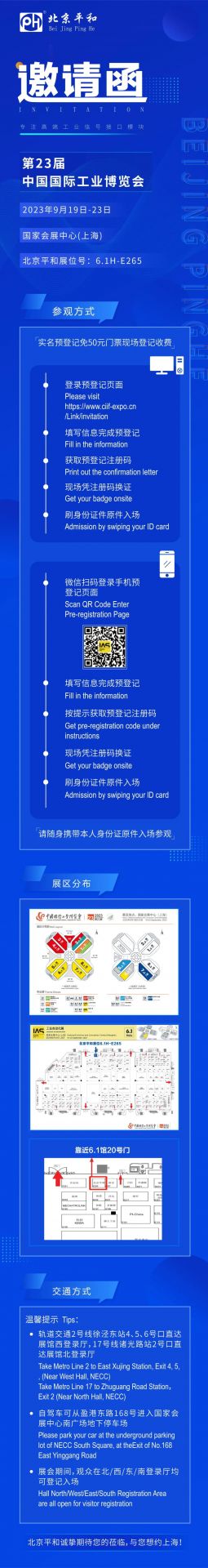 第二十三屆中國(guó)國(guó)際工業(yè)博覽會(huì)(以下簡(jiǎn)稱"中國(guó)工博會(huì)")將于2023年9月19日-23日在國(guó)家會(huì)展中心(上海)舉辦,屆時(shí),北京平和將亮相本次展會(huì),我們誠(chéng)邀您蒞臨北京平和展位:6.1館E265,北京平和將為您展示高質(zhì)量的產(chǎn)品及優(yōu)質(zhì)的服務(wù)!