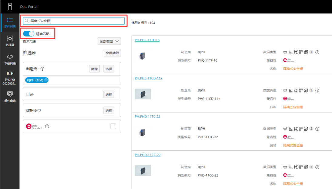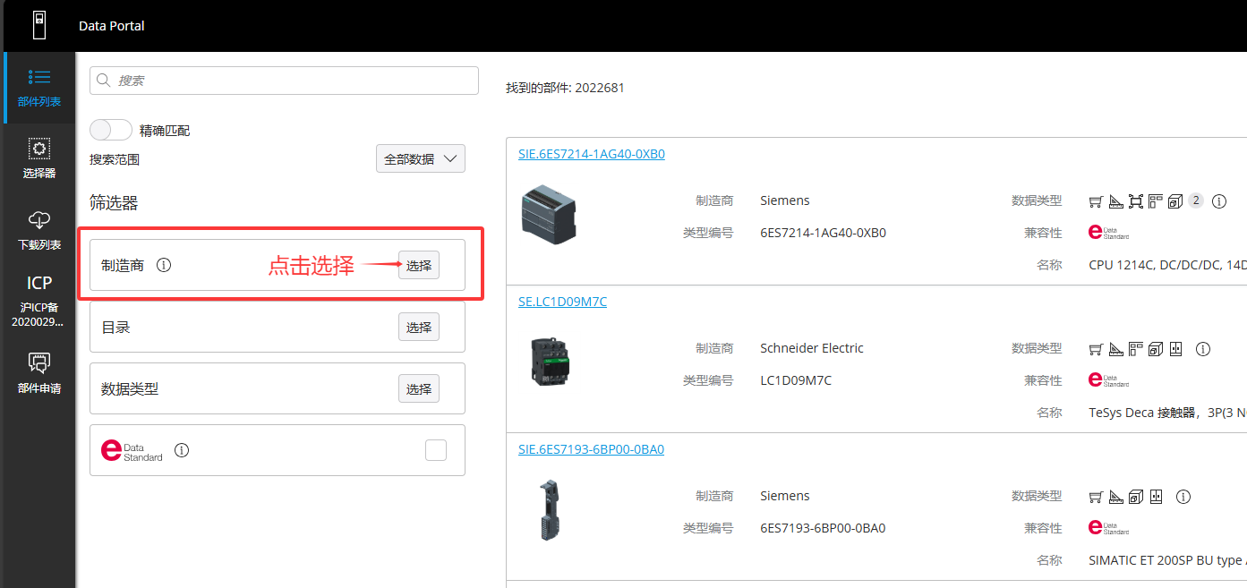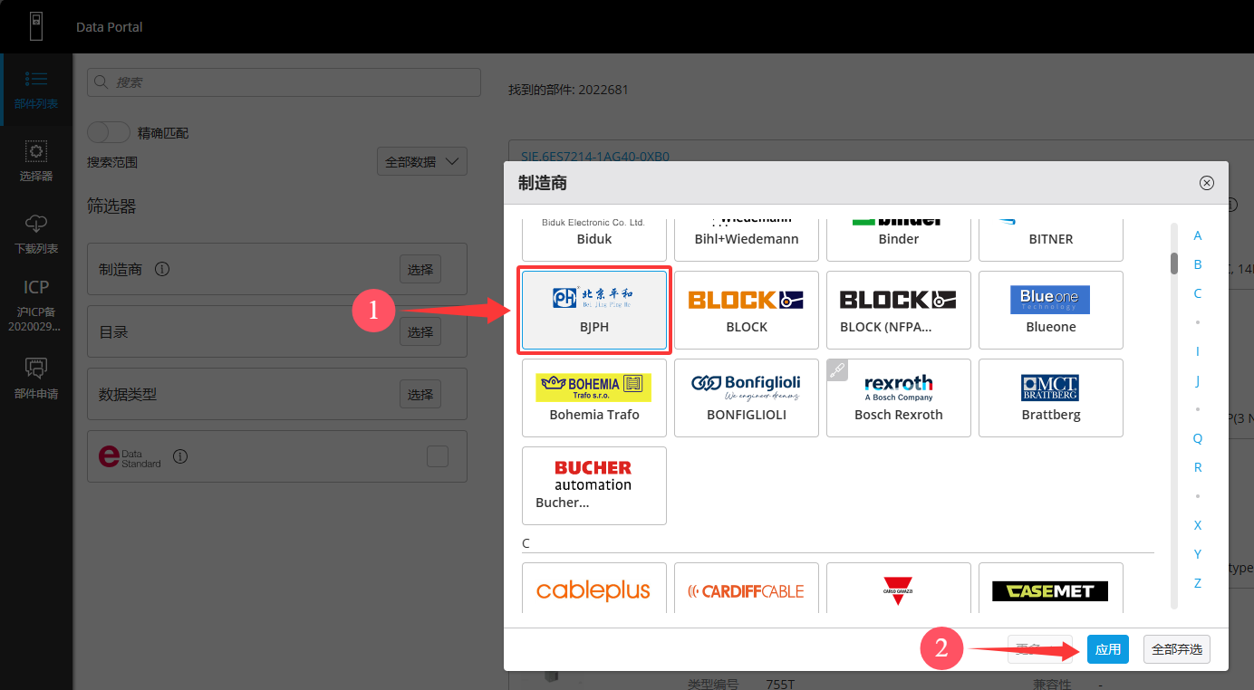 在Eplan Data Portal平臺中,點擊制造商選擇按鈕,選擇北京平和logo,點擊應(yīng)用。